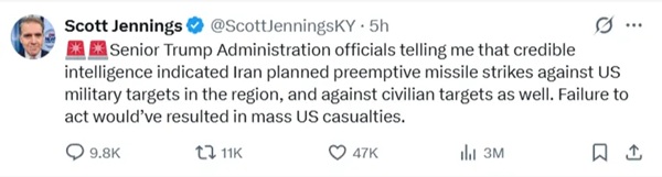 Les services secrets de l’administration Trimp m’ont informé que des renseignements crédibles indiquaient que des frappes préventives étaient prévues contre des cibles militaires américaines dans la région ainsi que contre des cibles civiles. Ne pas agir aurait entraîné des pertes humaines massives pour les États-Unis.